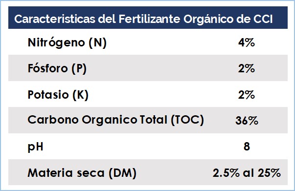 Digestato de BioGás: Fertilizante Orgánico, Rico en Nutrientes La materia orgánica digerida - el digestato - de las plantas de BioGás de CCI contiene una excelente combinación de nutrientes claves, especialmente nitrógeno (4%), fósforo (2%) y potasio (2%). En combinación con un pH de 8, la excelente relación N:P:K permite que las raíces de plantas absorban los nutrientes mejor y más rápido. La liquidez del digestato se puede controlar entre 2.5% y 25% para adaptarse a los requisitos de almacenamiento, transporte y aplicación. |